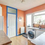 The kitchen features a range of base and eye level units with a stainless steel sink and tiled splashback. Space is given for cooker, fridge freezer and washing machine.