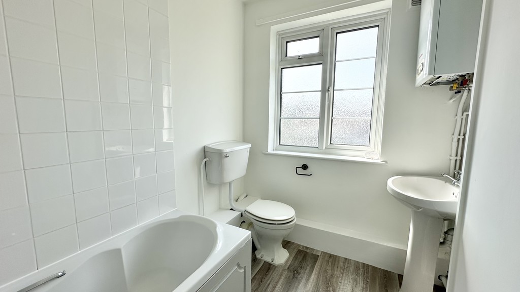 BATHROOM/WC White suite comprising panelled bath, wash hand basin and low flush W.C. Obscure double glazed window to side. Radiator.