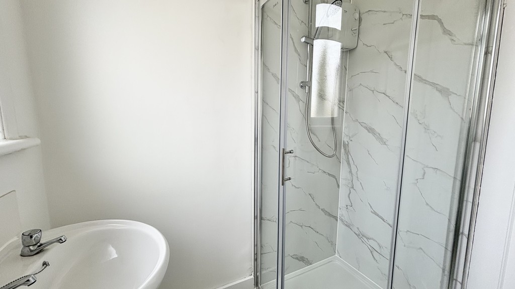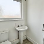 BATHROOM 6' 00" x 5' 01" (1.83m x 1.55m) Low flush WC. Hand wash basin. Corner shower. Radiator to side. Tile effect vinyl to floor. Double glazed window to rear.